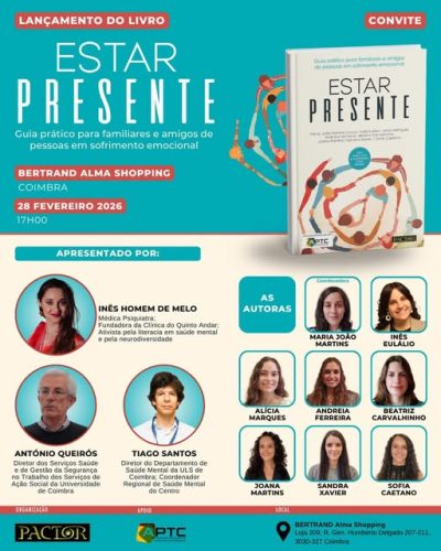 03/03/2026Lançamento do Livro “Estar Presente – Guia Prático para familiares de pessoas em sofrimento emocional”, em Coimbra, Bertrand – Alma Shopping, 28/02/2026, 17 Horas. FamiliarMente, Federação Portuguesa Associações Famílias Pessoas Com Exp.DM será representada por Cláudio Preto, da Associação de Familiares “Dar Voz”.
